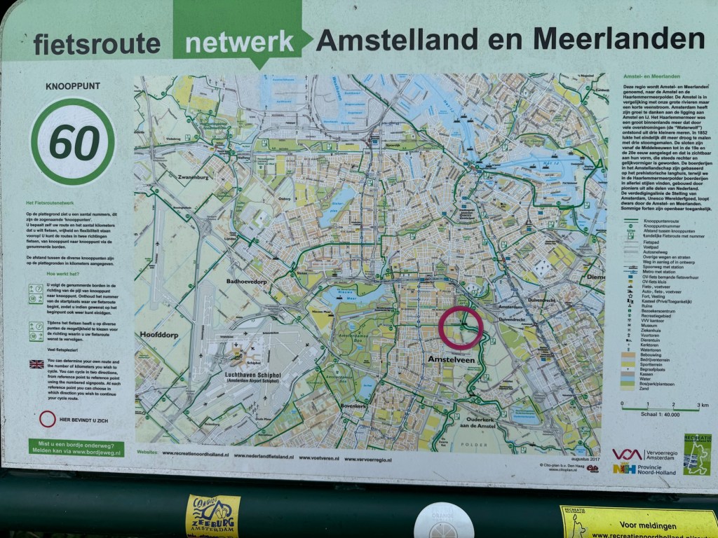 Bike grid and handy maps. Also pictured below, you can see the fietsroute (bike route) system, where major destinations are numbered, and highly visible signs guide you along your route. Major intersections and numbered destinations have large, easy to read maps, to help you find your next waypoint. Once you have it, just follow the signs with your number, and go!