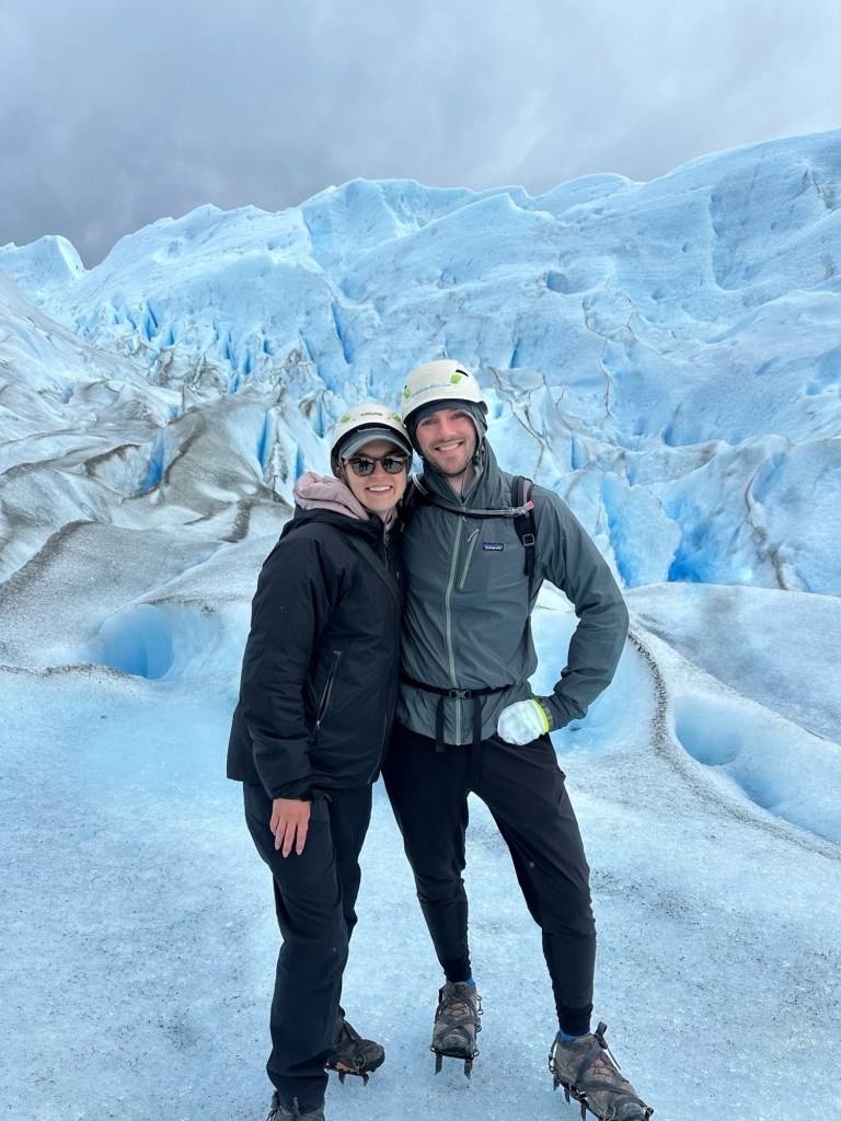 Today was a full-day hike guided by Leo, the craftiest guide in El Chalten and the nicest man in Argentina*. We drove a ways outside town this morning to have a longer one-way route, worth it for the additional views. Over the course of 15 miles and 3,100 vertical feet, we saw glaciers and the moraines they left behind over millions of years of glacial movement; we saw the Fitz Roy massif summits, the surrounding peaks, and rivers and lakes all the way to the horizon. I’ve never seen a glacier before (Kelly has), and it’s impossible to describe. It is eerily silent and still, but also appears to rush toward you from the base of those iconic granite peaks, literally frozen in time. We learned that the peaks of the Fitz Roy (aka Chalten) range were all formed by venting magma under the Pacific Ocean ~16 million years ago (a baby in mountain time). The magma cooled into those shapes. The peaks were pushed partially above ground by tectonic plate movement, and then the glaciers scraped away the rest, resulting in the formation pictured above (and in the Patagonia(TM) logo). We finished at a brewery for beers with Leo—resting our feet, reflecting on the day, and thanking him for so earnestly sharing his love of the mountain with us. This was by far my biggest hike ever, and maybe Kelly’s as well, though she’s done some long ones. The views were stunning, but equally great was experiencing something so rare and awe-inspiring together on our honeymoon.