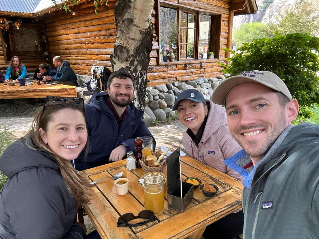This morning we left bucolic Bariloche, flew south, and had an epic drive from Calafate airport to El Chalten, a tiny town of ~500 people. This is a no-frills place, full of hardcore hikers and climbers (and us). Looking at where we are on the map, we were feeling very far from home; so it was a welcome surprise to bump into friends from Chicago and join them for lunch. The restaurant where we saw them is on the lot directly between our two hotels.