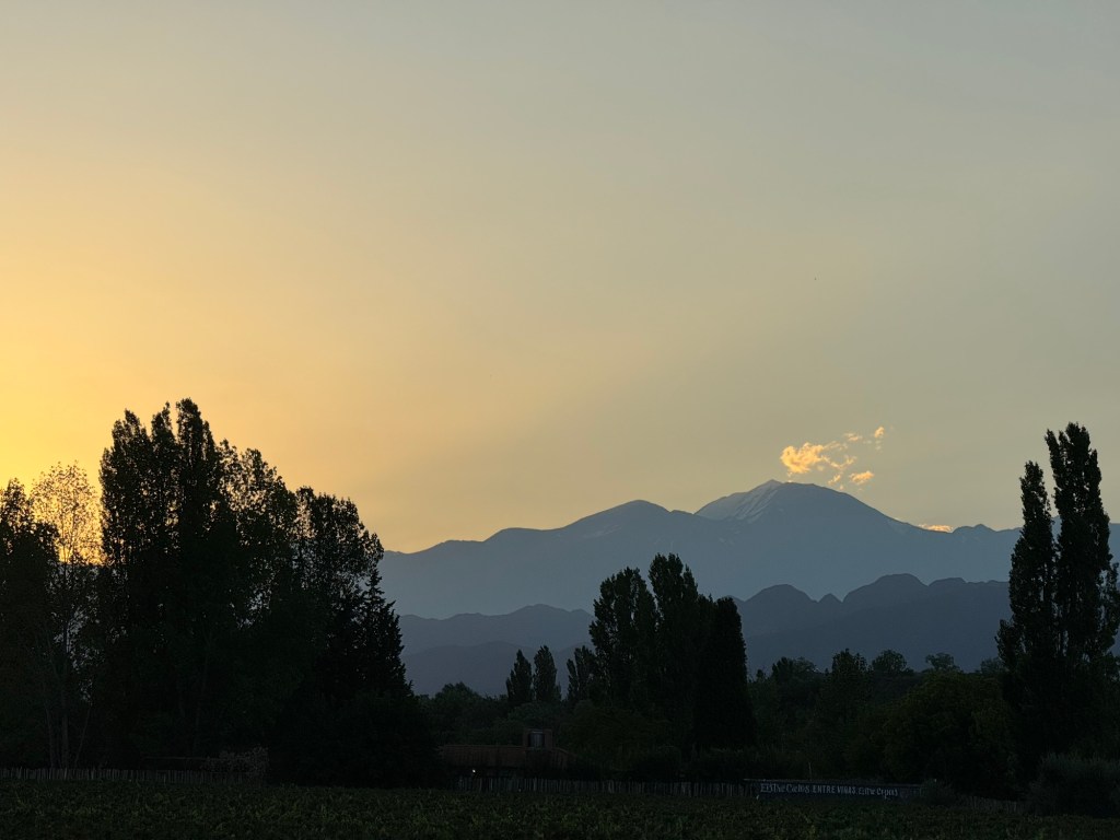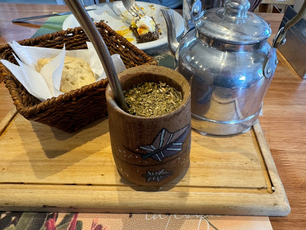 One of the first things about you notice in Argentina is the mate culture (🗣️👂“mah-tay”). Everyone has his or her own little mate cup, sometimes a glass or metal mug, but often a traditional gourd wrapped in leather. You fill the cup with the tea leaves in the morning, and bring a giant thermos of hot water with you throughout the day, pouring a little water and taking a few sips when you need a boost. Native people drank it through their teeth and spit the leaves, but now people use a metal straw with a wire or mesh filter at the bottom. Even on our domestic flights, we see plenty of mate, sometimes with the gourd, thermos, and snacks all in a little square leather carrier with a handle. I had my first mate at La Esquina here in El Chalten, and it was an experience. I’d been warned to be careful, as it is “quite stimulating,” but still I wasn’t ready for the amount of caffeine—I was wired and my head was swimming! The taste is super bitter, definitely something I’d need to get used to. They encourage newbies to add honey, but of course I had to be hardcore.