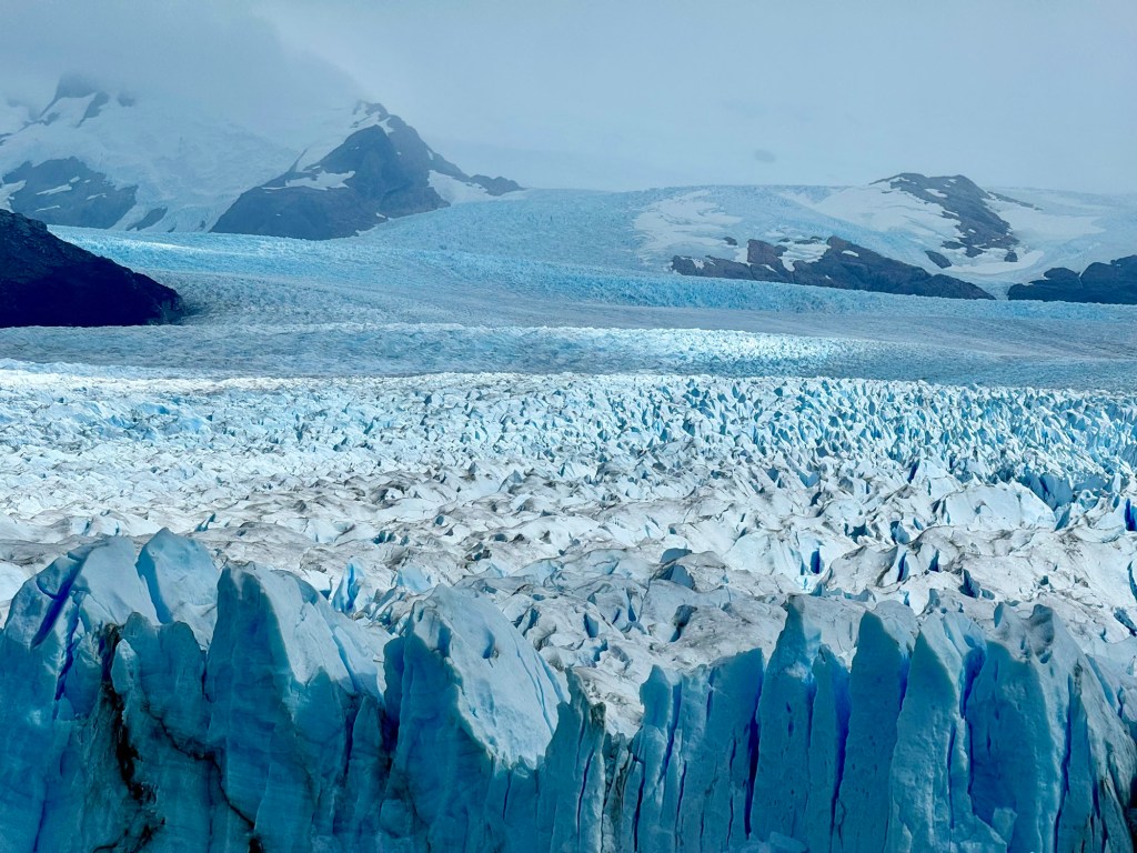 Hiking on the glacier. I think it will take a long time, maybe years, before the significance of this experience fully sinks in for me. The Perito Moreno Glacier, about 1.5 hours west of El Calafate, is named for the famed explorer. Moreno discovered and named just about every place we’ve visited on this trip. You drive to the national park, continue to the end of the road, and board a boat to cross to the glacier. After a short hike you get your crampons and helmet, and walk around on a tiny area of the massive 100 square mile glacier. After the hike, and having enjoyed a whiskey on-the-glacial-rocks, you ferry back and view the glacier’s eastern and northern faces from a network of catwalks on the adjacent hills. It’s summer here, and it’s hot. As always during summer, on display is the hypnotic, quaking sight and sound of apartment-building-sized ice chunks cracking, tilting, and crashing into the water 200 feet below. The sound is like something from an another dimension, mechanistically translated to ours.