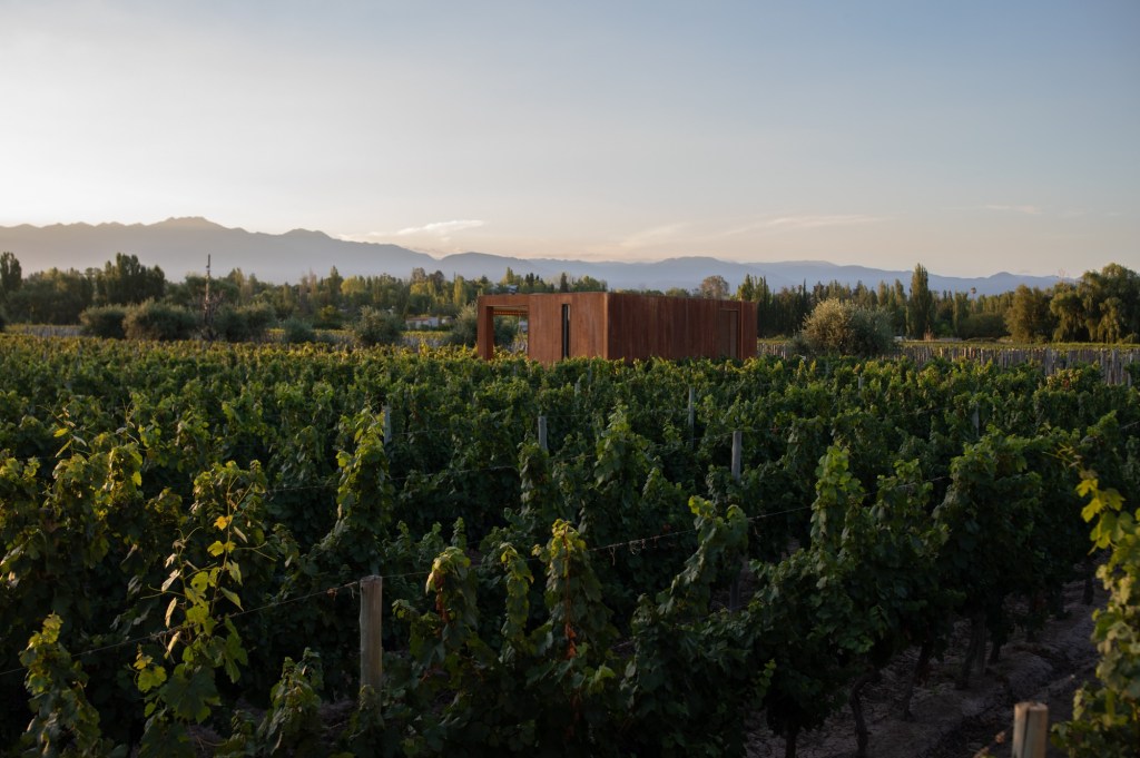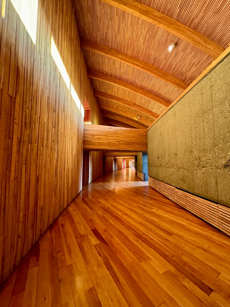 Its architects, Cazú Zegers, Rodrigo Ferrer, and Roberto Benavente, sought to create a structure with a sense of place, a geo-poetic work in which the key element was beech wood worked to resemble the texture of the old-time sheep barns on the ranches where they once dried the wool and leather.”